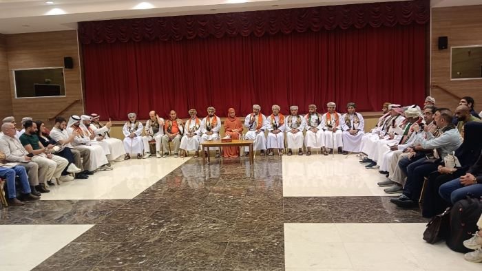 His Excellency Dr. Mohammad Al Mahri, Wali of Adam, along with dignitaries, welcoming international journalists at the Government Office in the Governorate of Adam Province.