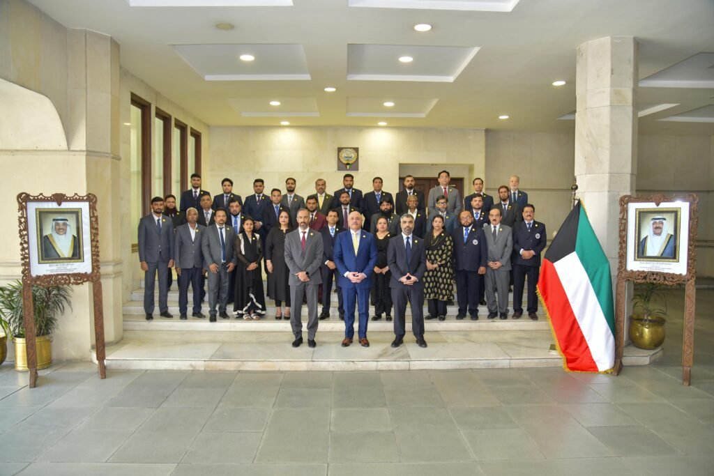 H.E. Mr. Meshal Mustafa J Al-Shemali, Ambassador of the State of Kuwait to the Republic of India, along with members of the Kuwaiti mission, recently marked a powerful moment of national pride and unity by wearing the “Al-Arfaj” flower badge, the national flower of the State of Kuwait. This symbolic gesture goes beyond mere adornment; it reflects a deep sense of solidarity, loyalty, and reverence for those who stand at the forefront of safeguarding the nation.